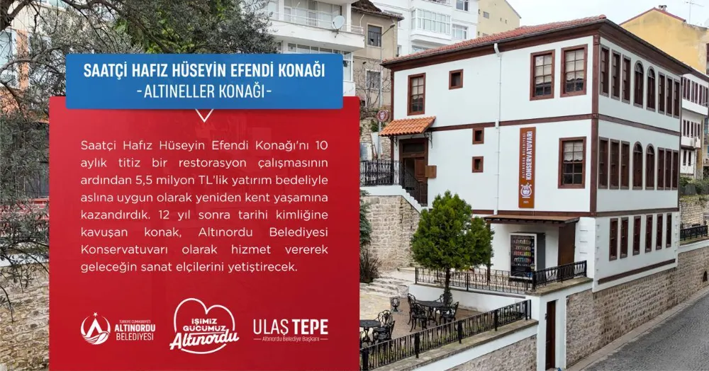 Altınordu Belediyesi, Ordu Valiliği’nin desteğiyle 10 aylık restorasyonun ardından 1885 yapımı Saatçi Hafız Hüseyin Efendi Konağı’nı 5,5 milyon TL yatırımla aslına uygun şekilde restore ederek Konservatuvar olarak hizmete sundu. Başkan Ulaş Tepe, tarihi konakta 140 öğrencinin sanatla buluştuğunu ve eserin kültürel miras olarak gelecek nesillere taşındığını vurguladı.